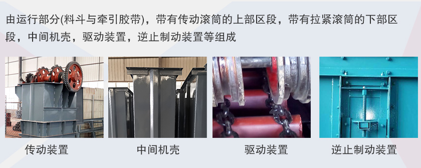 td斗式提升機牽引件為橡膠帶,料斗以一定的間隔固定在橡膠帶上,橡膠帶分別繞過提升機頭部和底部的滾筒,構成具有上升有載分支和下降無載分支的閉合環(huán)形系統(tǒng);工作時,布置在提升機頭部的驅(qū)動裝置通過頭部滾筒將動力傳給橡膠帶和料斗,物料從提升機底部的進料口進入料斗,料斗將物料提升至頭部的卸料口,在離心力和重力的共同作用下,料斗中的物料經(jīng)卸料口卸出。