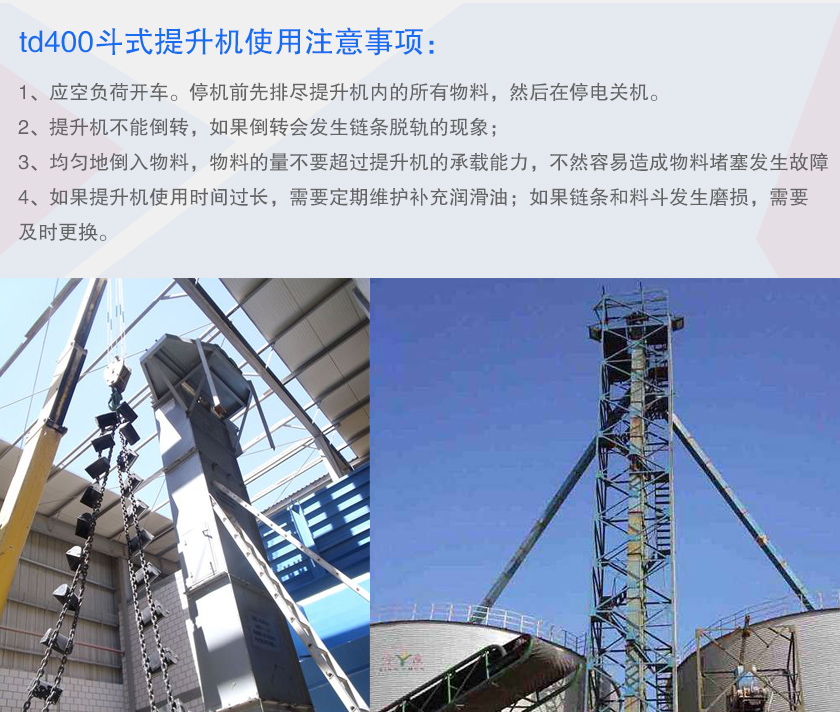 4、如果提升機使用時間過長,需要定期維護補充潤滑油;如果鏈條和料斗發(fā)生磨損,需要及時