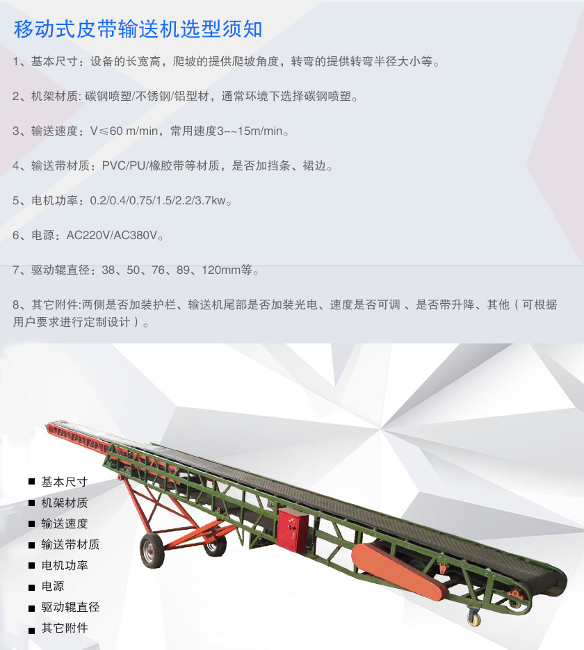 移動式皮帶輸送機由驅動裝置、輸送帶、行走輪、萬向輪、升降裝置、張緊裝置等、改向裝置組成。