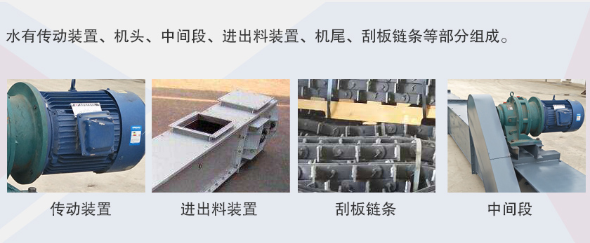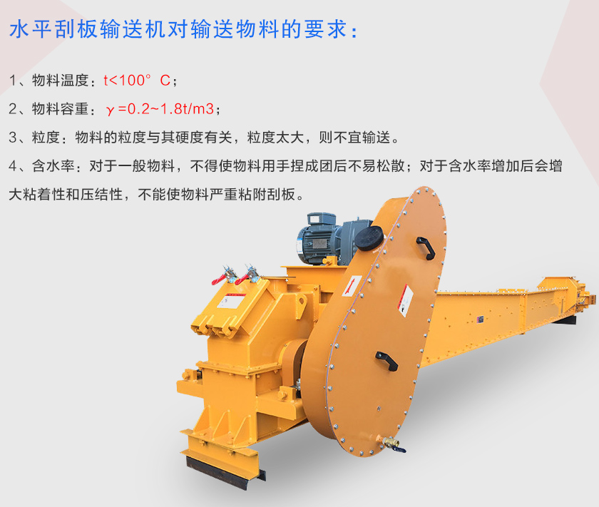 水平刮板輸送機有傳動裝置、機頭、中間段、進出料裝置、機尾、刮板鏈條等部分組成。