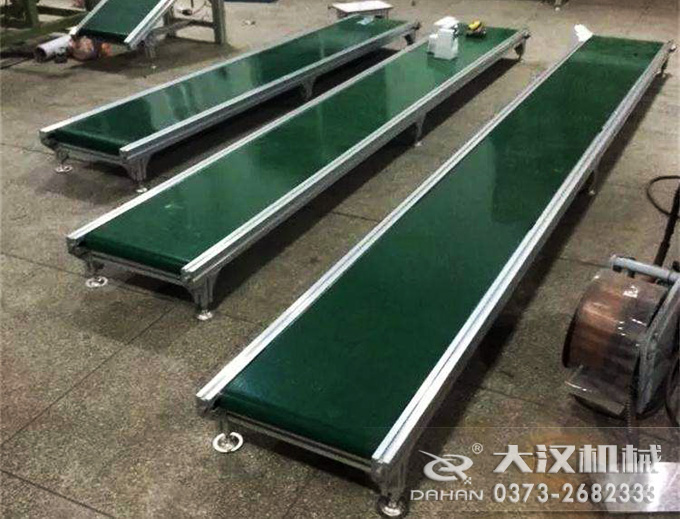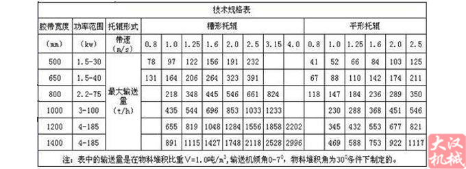 水平皮帶輸送機按其支架結(jié)構(gòu)有固定式、移動式兩種:按輸送帶材料有膠帶、塑料帶和鋼芯帶之分。皮帶輸送機的工作環(huán)境溫度一般在-10°C--+40°C之間,要求物料溫度不超過70°C;耐熱橡膠帶可輸送120°C以下的高溫物料。物料溫度更高時不宜采用膠帶輸送機。當輸送具有酸性堿性油類物質(zhì)和有機溶劑等成分的物料時,需采用耐油、耐酸堿的橡膠帶式塑料帶。帶式輸送機的帶寬可分為:500、650、800、1000、1200和1400mm。用戶可根據(jù)帶式輸送機的輸送長度,物料的種類、容重、輸送量、輸送長度等諸因素通過計算確定輸送機的布局以及所選用的膠帶寬度、帆布層數(shù)和膠帶厚度。