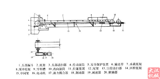 1.驅(qū)動部分:系由裝置在型鋼焊成的底座上的電動機-->高速聯(lián)軸器-->減速器-->減速聯(lián)軸器組成。根據(jù)要求:驅(qū)動裝置設(shè)有左裝和右裝兩種,另外本公司配有功率1.5KW-13KW,速度0.80、1.0、1.25的油冷式電動滾筒。 2.滾動部分:分傳動滾筒和改向滾筒兩大類。 3.托輥部分:分槽形、平行、調(diào)心和緩沖托輥等。 4.清掃部分:分彈簧清掃器和空段清掃器。 5.卸料部分:分固定式犁式卸料器和電動卸料器。 6.制動部分:有帶式逆止器和滾柱逆止器兩種。 7.附件:有罩殼、導料槽、漏斗等。