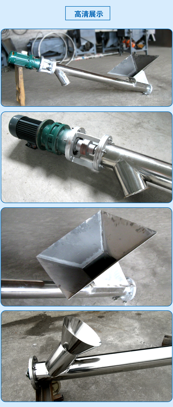 糧食螺旋輸送機對于衛生環境要求較高,所以一般除了電機、軸承、機架外其余為不銹鋼制成,糧食螺旋輸送機可以用來輸送玉米、稻谷、食鹽、黃豆、面粉、淀粉等粉末或顆粒狀物料。輸送方式有水平式、傾斜式和垂直式三大類型,根據輸送物料的難易程度可以選擇螺旋葉片的設計(有軸和無軸),同時可以按照輸送現場要求在糧食螺旋輸送機上安裝滑輪。