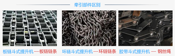 環鏈斗式提升機牽引件選用優質合金鋼高度圓環鏈;板鏈斗式提升機的鏈條是優質合金鋼高強度板式鏈條;膠帶斗式提升機采用高強度的鋼絲繩作為牽引部件。