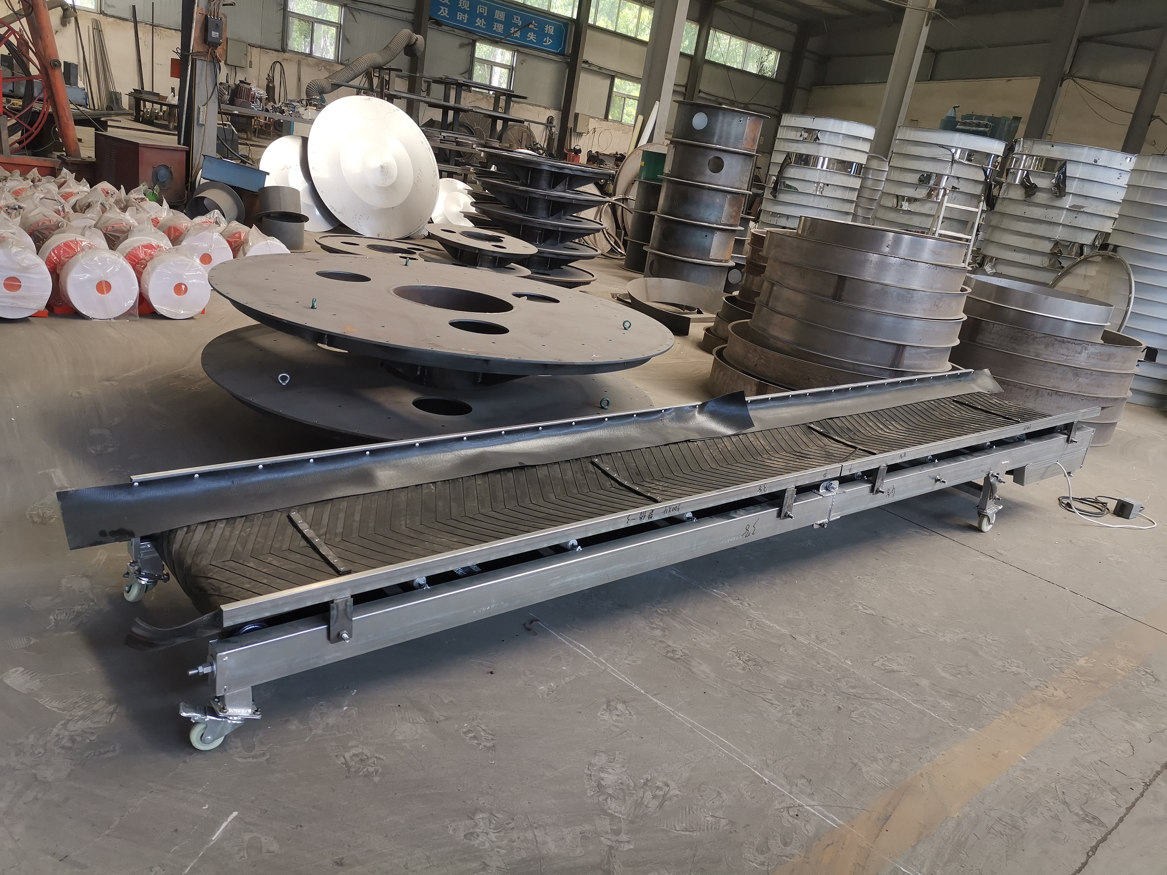2、水平帶式輸送機底部裝有萬向輪,可隨處移動。