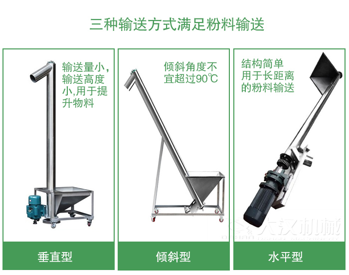 垂直型管式螺旋輸送機——輸送量小,輸送高度小,轉速較高,能耗大。特別適宜輸送流動性好的粉粒狀物料,主要用于提升物料,提升高度一般不大于8米。